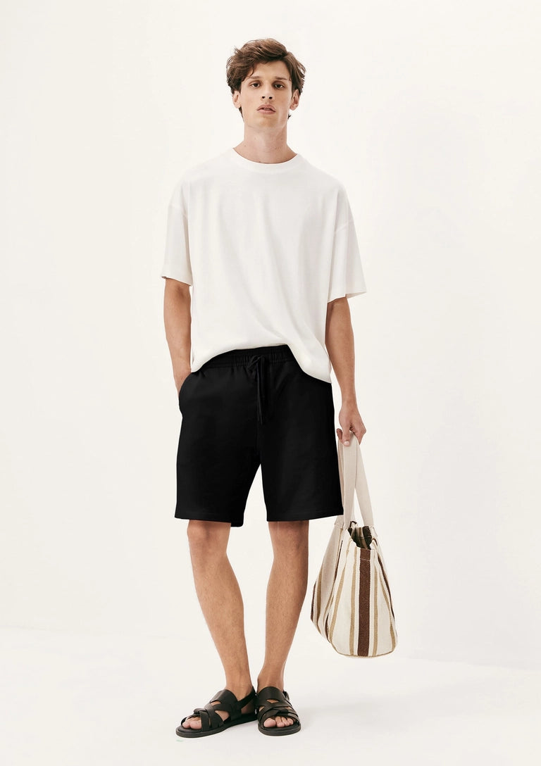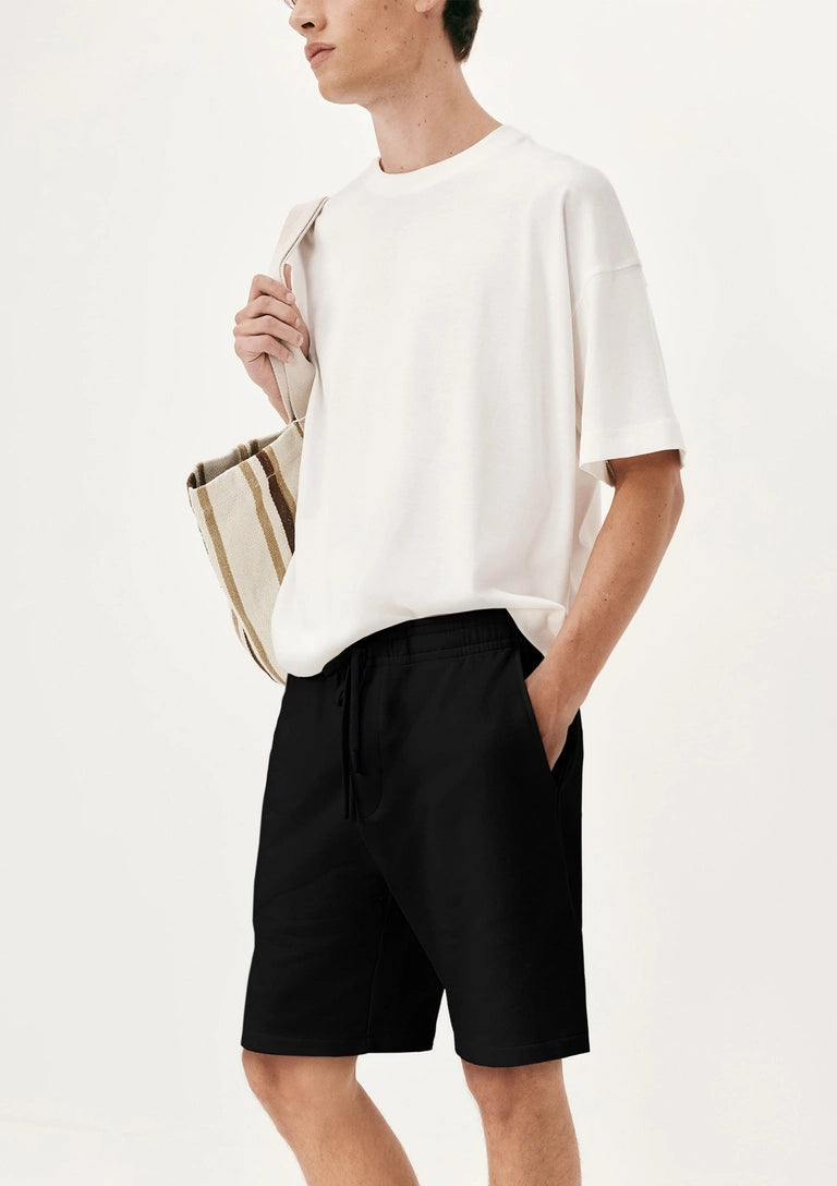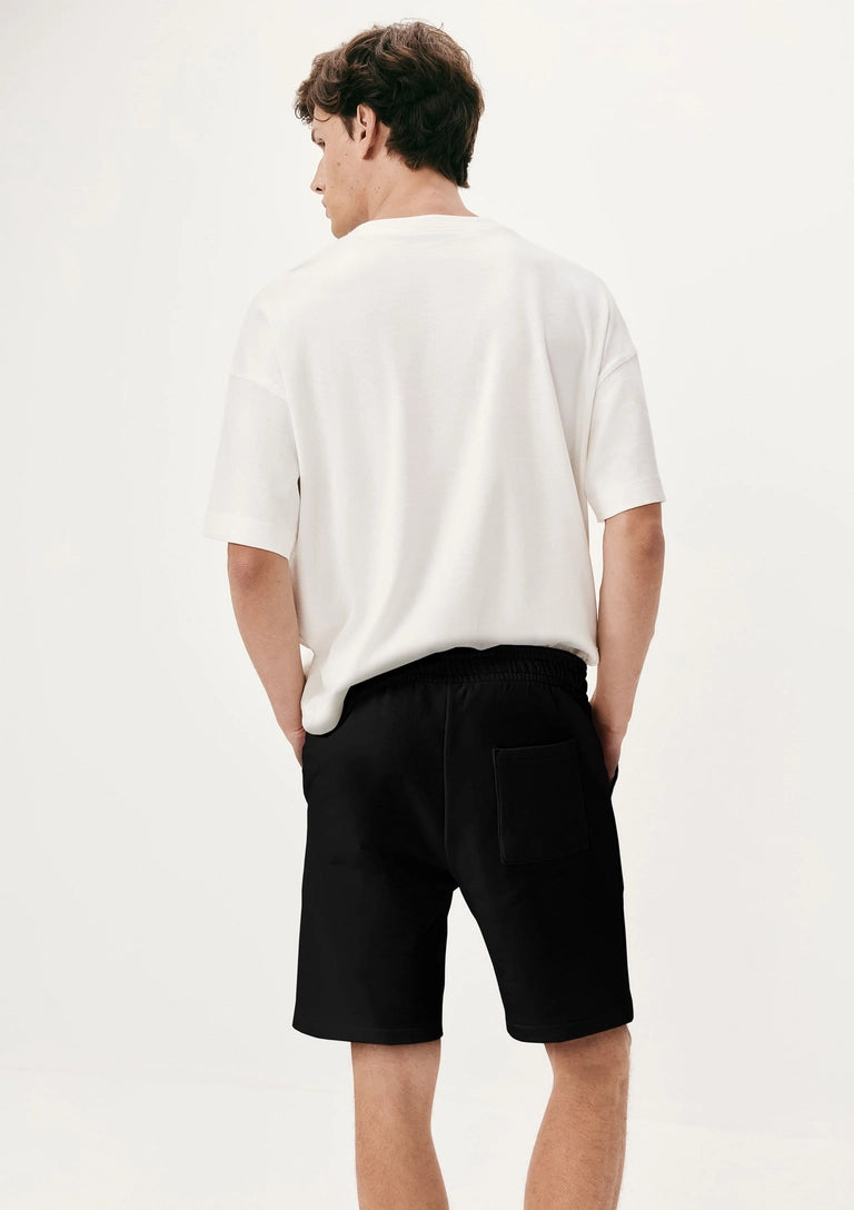 Bermuda confeccionada em moletom não peluciado. Em modelagem reta, solta ao corpo, conta com cós em elástico, bolsos embutidos e cordão para ajuste.